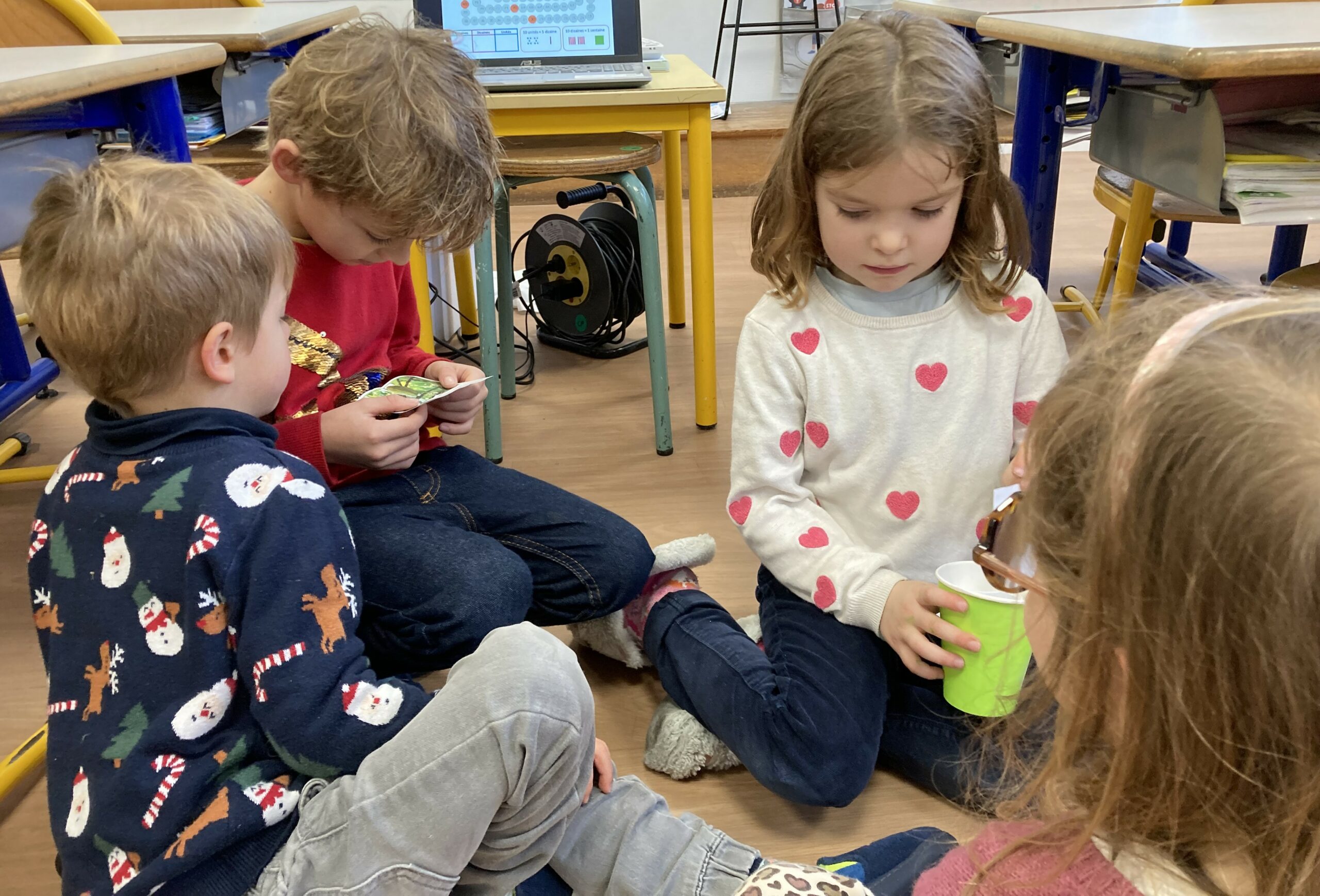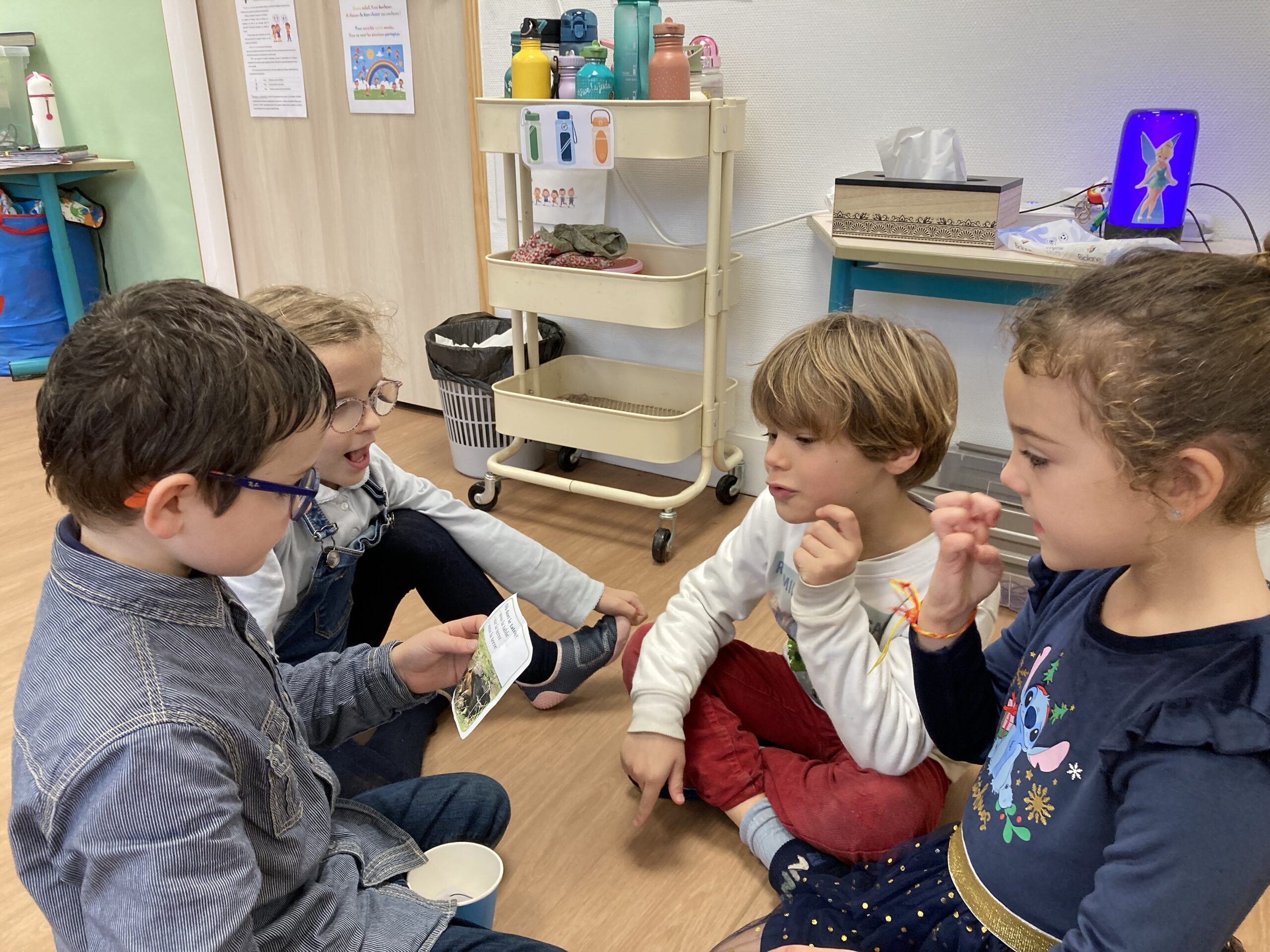 Par groupe de 4 (2 élèves de CP et 2 élèves de GS), les joueurs devaient choisir la bonne réponse à une question parmi trois propositions de réponse. Les CP remplissaient à tour de rôle la fonction de lecteur et les GS devaient sélectionner la réponse correcte.