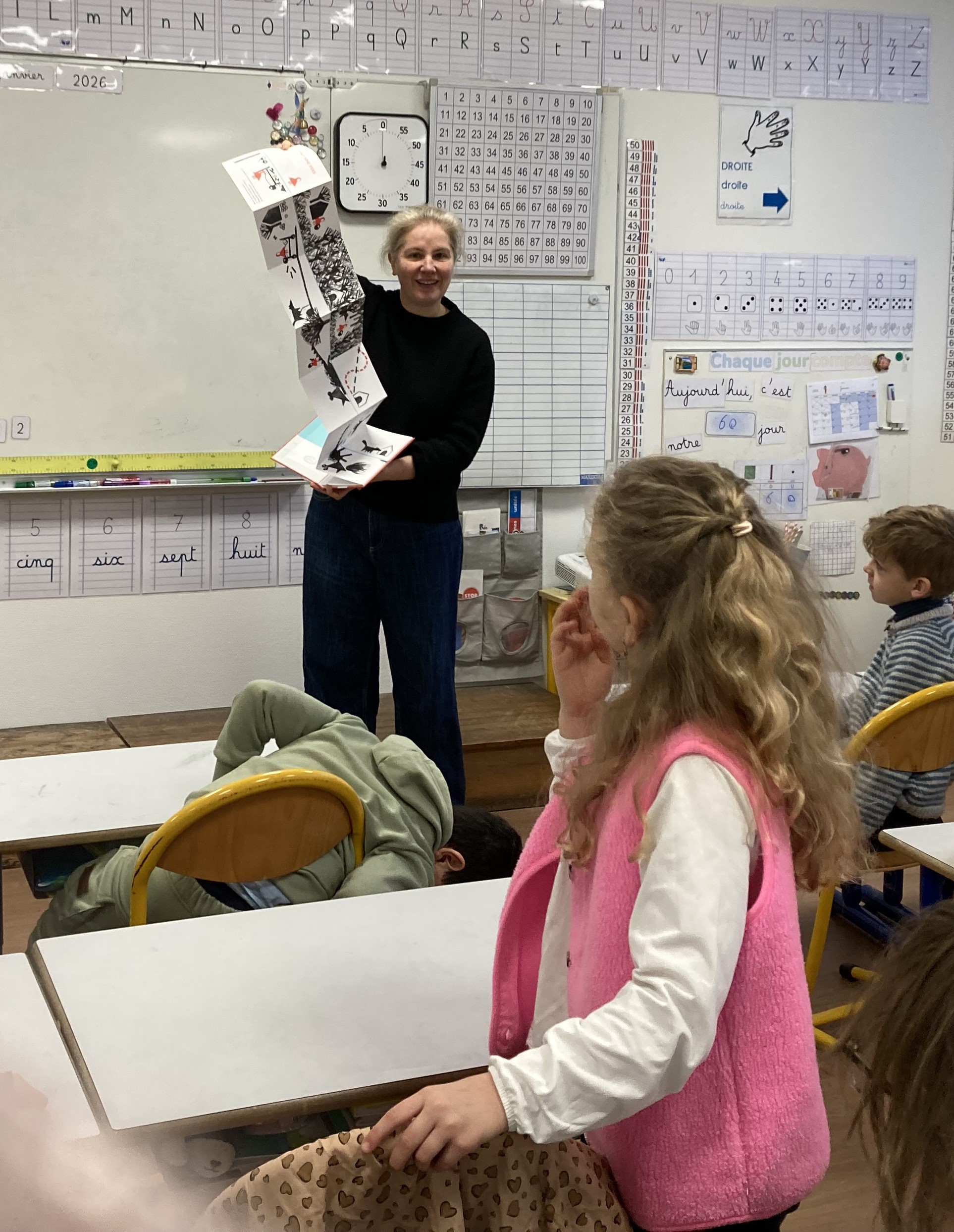 Lors de sa première intervention en classe, Emmanuelle nous a lu quelques unes de ces oeuvres. Cette autrice-artiste a ensuite guidé les élèves dans la réalisation de tampons puis d’histoires au format leporello (livre accordéon).