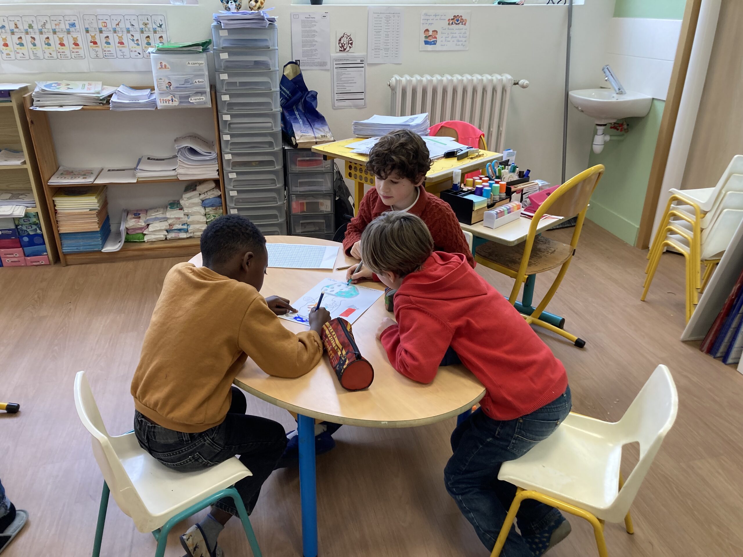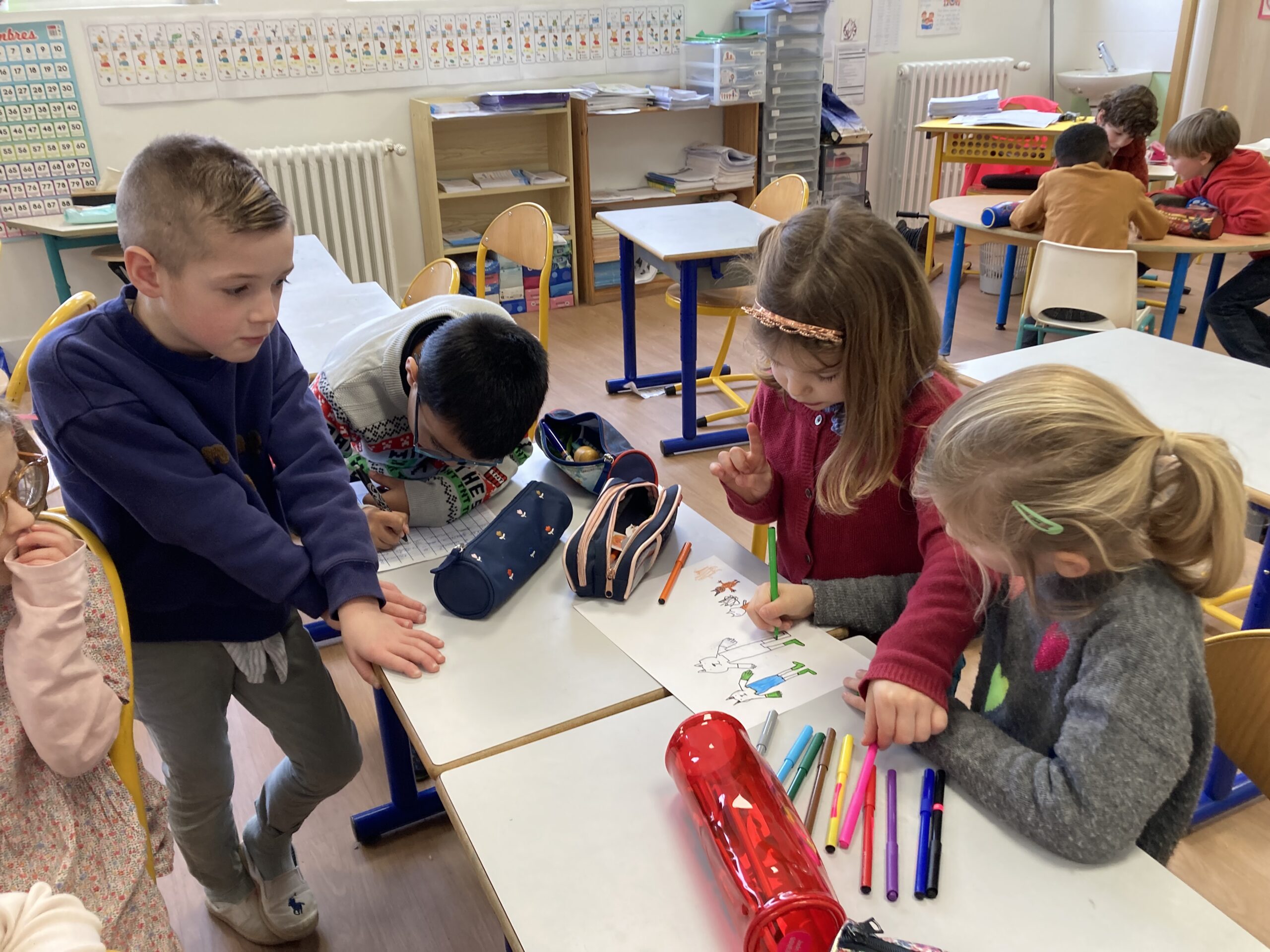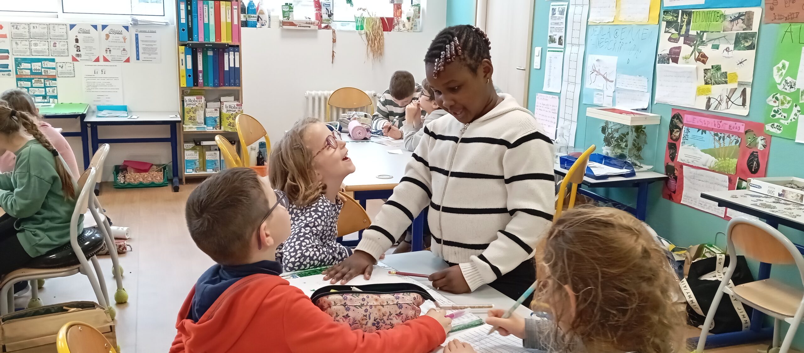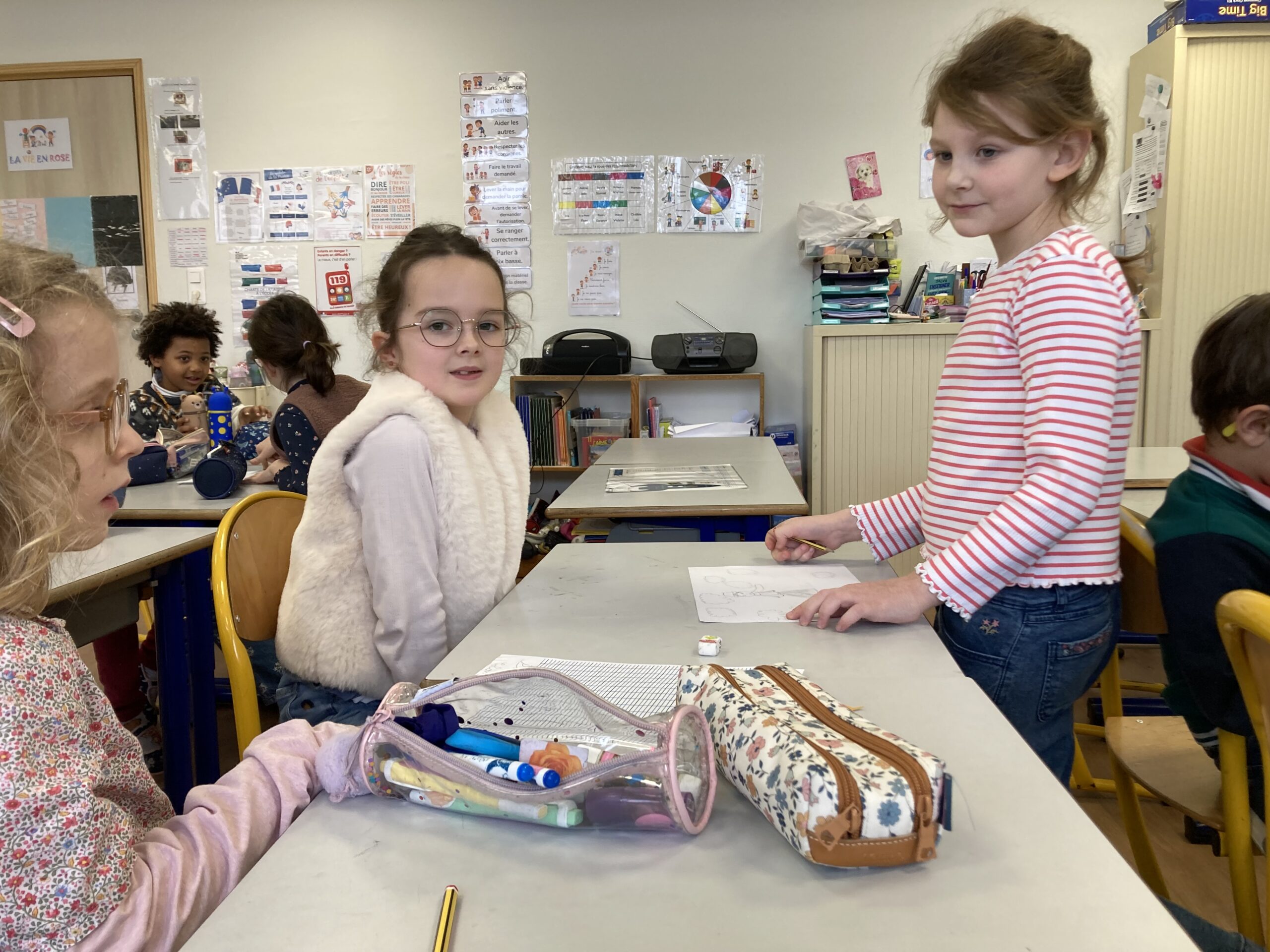 Pour leur donner l’occasion de les partager et d’y trouver des réponses, des groupes de trois ou quatre élèves mêlant CE1 et CP ont été créés avec comme objectifs d’illustrer par des exemples écrits puis par le dessin un des thèmes du film.
