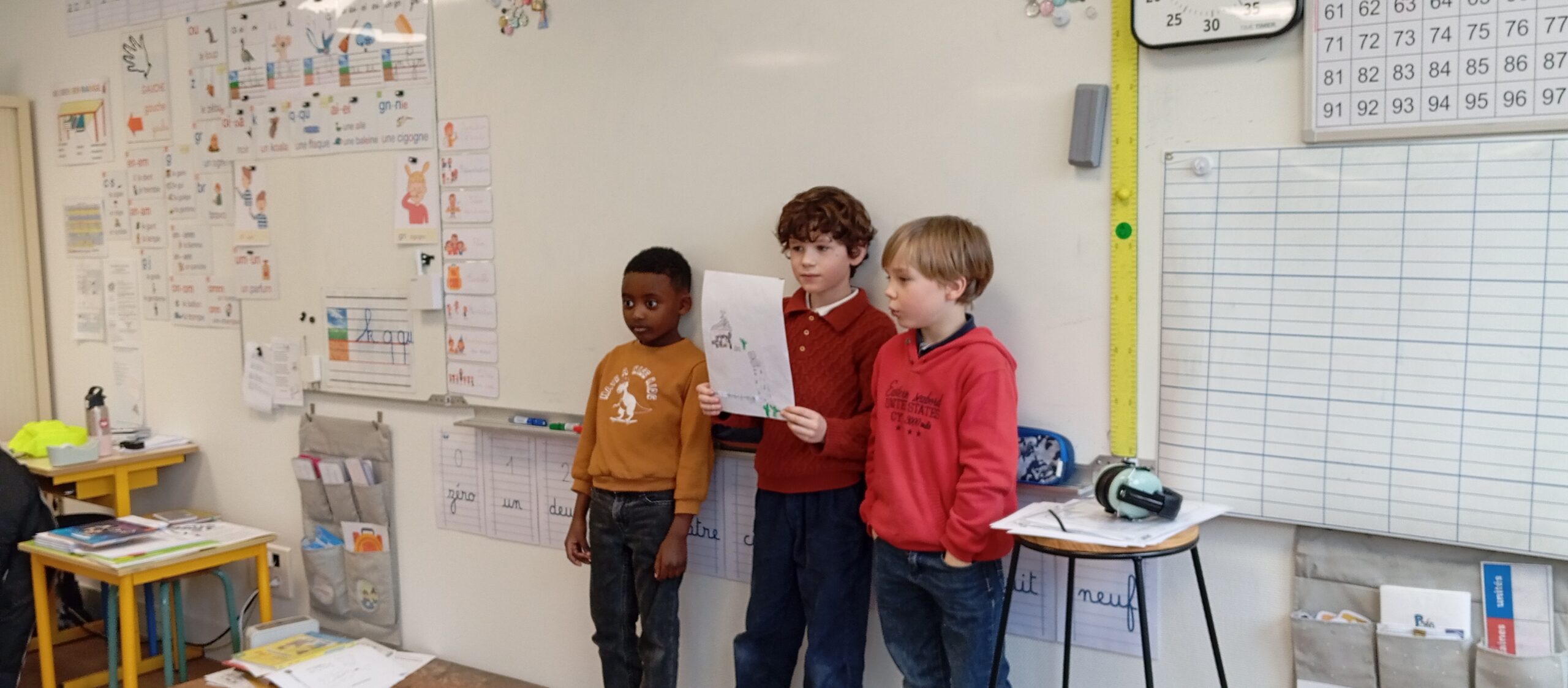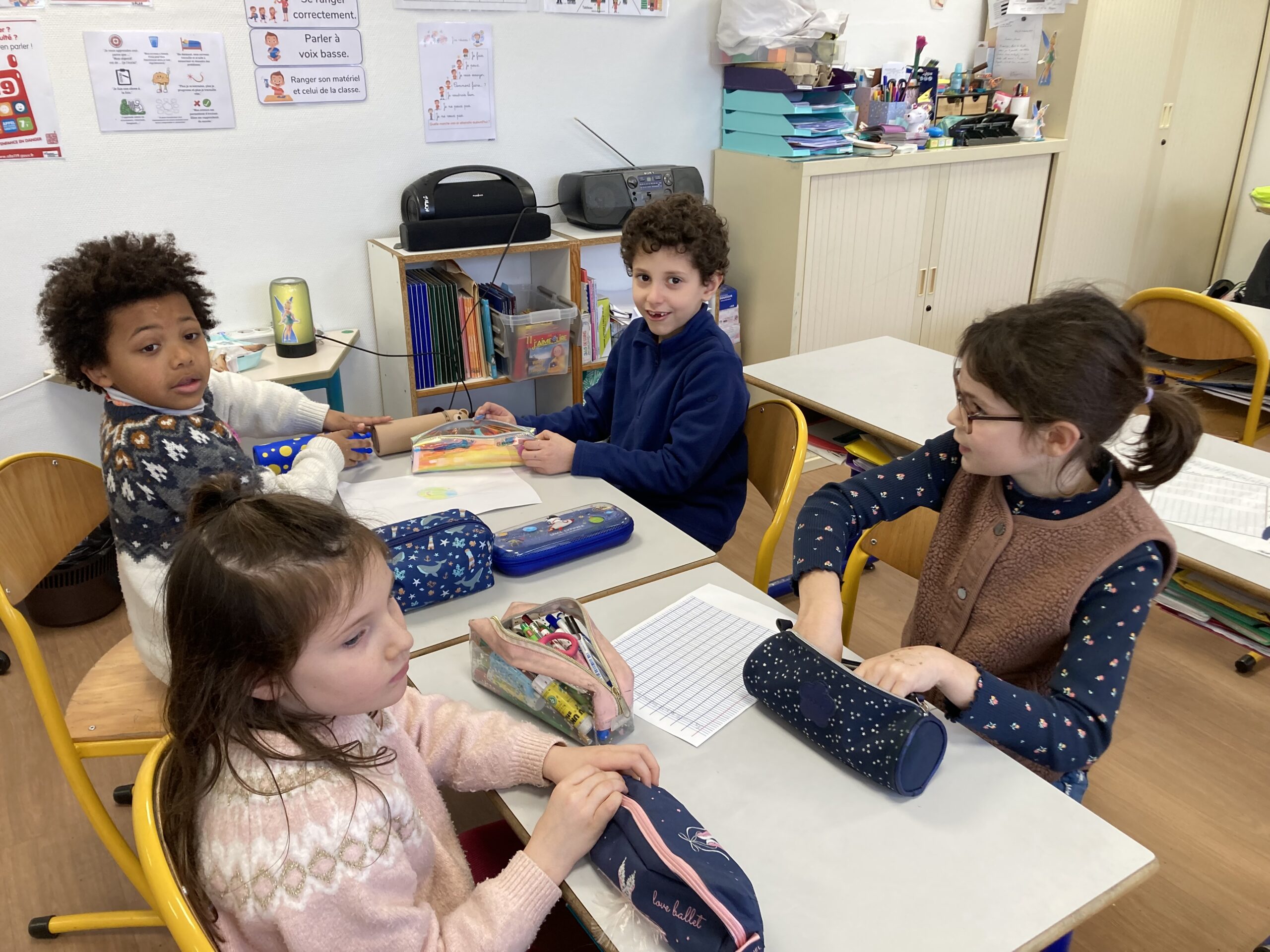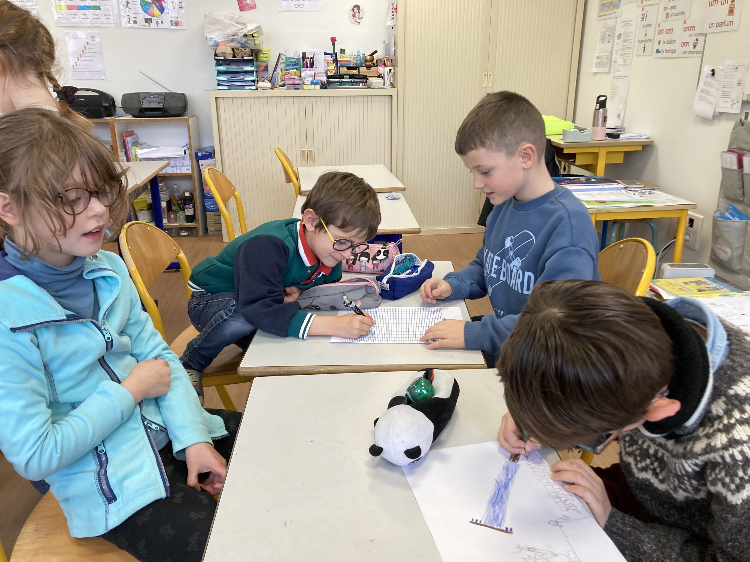 Pour leur donner l’occasion de les partager et d’y trouver des réponses, des groupes de trois ou quatre élèves mêlant CE1 et CP ont été créés avec comme objectifs d’illustrer par des exemples écrits puis par le dessin un des thèmes du film.