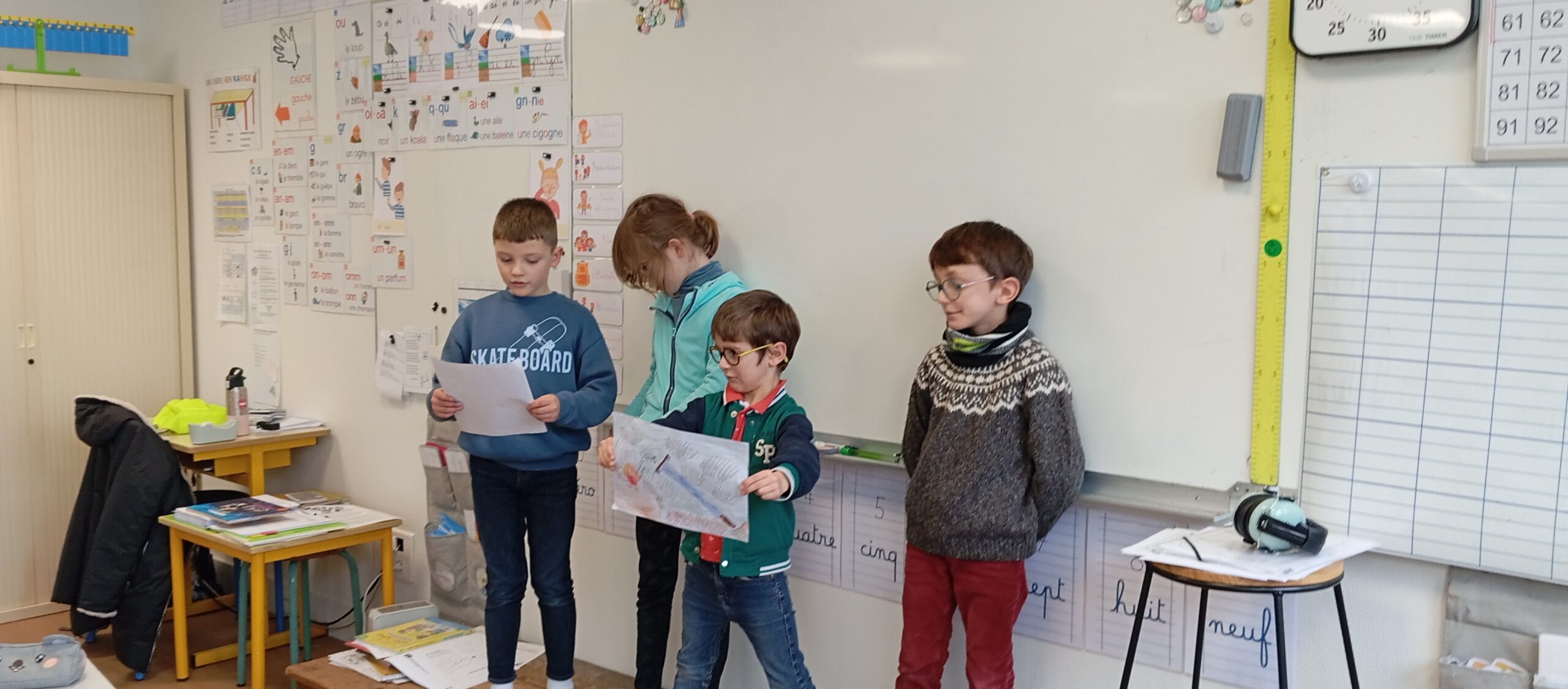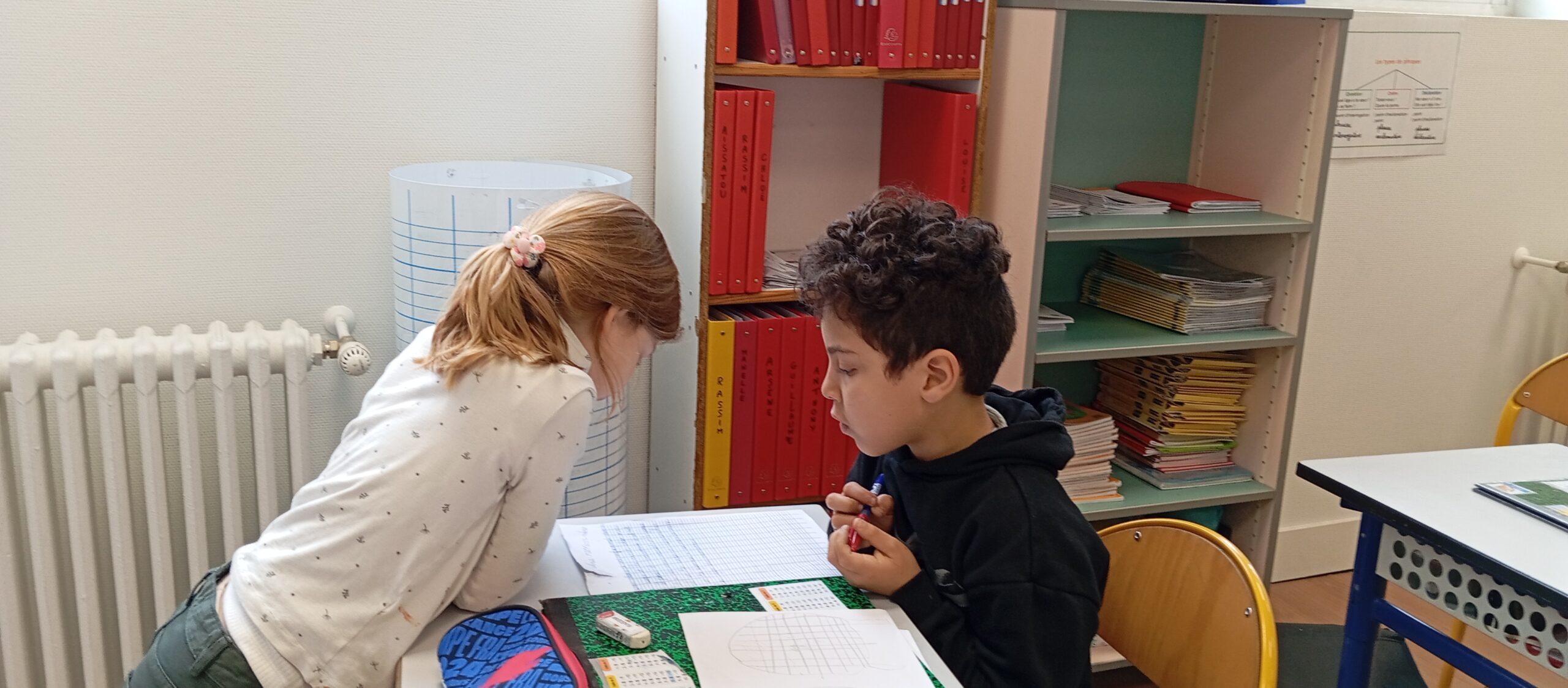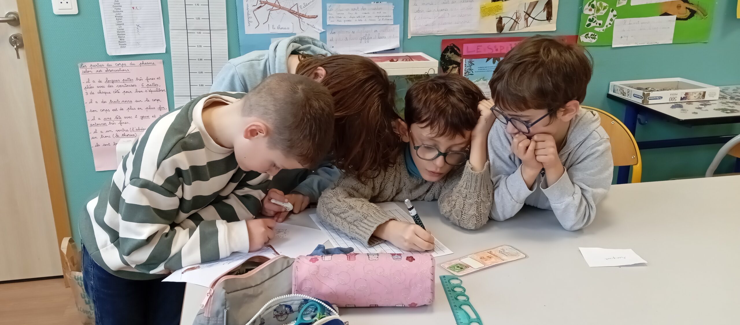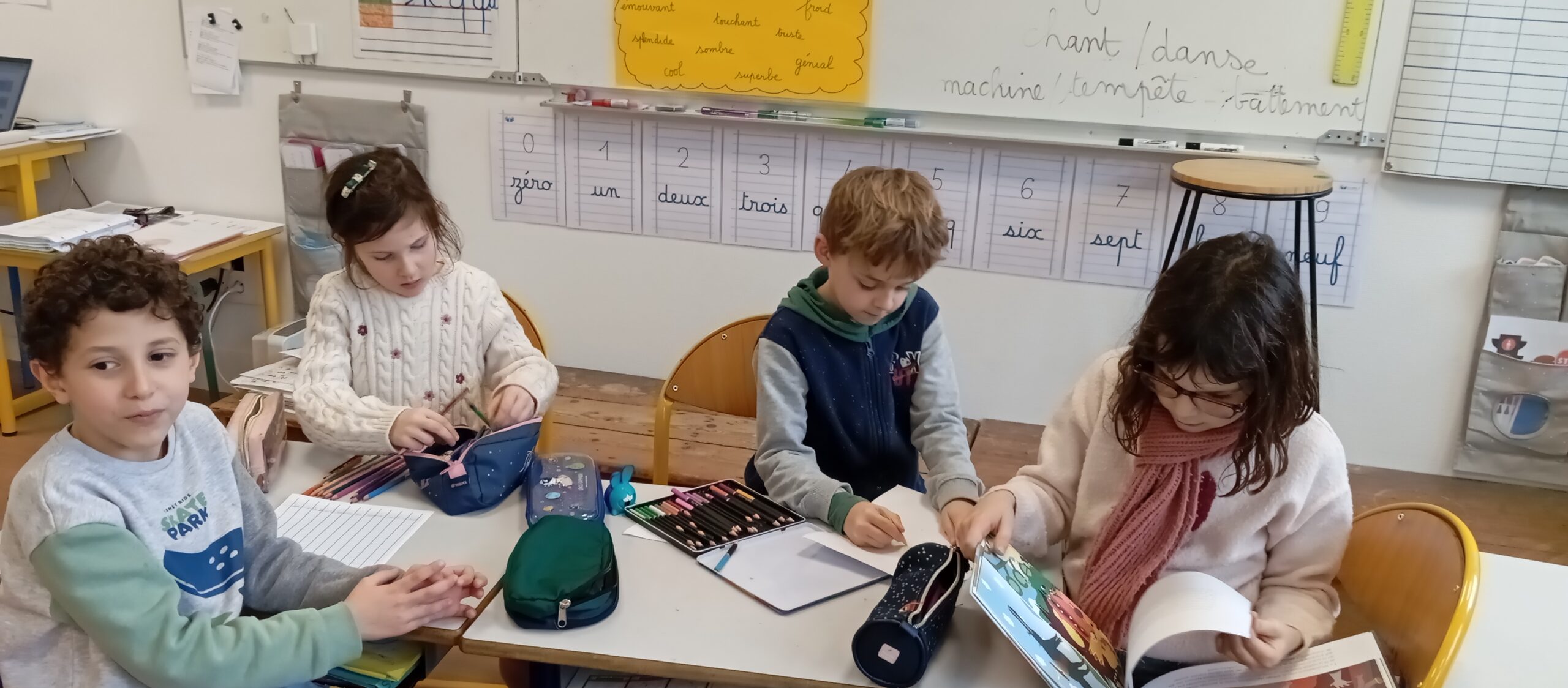 Pour leur donner l’occasion de les partager et d’y trouver des réponses, des groupes de trois ou quatre élèves mêlant CE1 et CP ont été créés avec comme objectifs d’illustrer par des exemples écrits puis par le dessin un des thèmes du film.