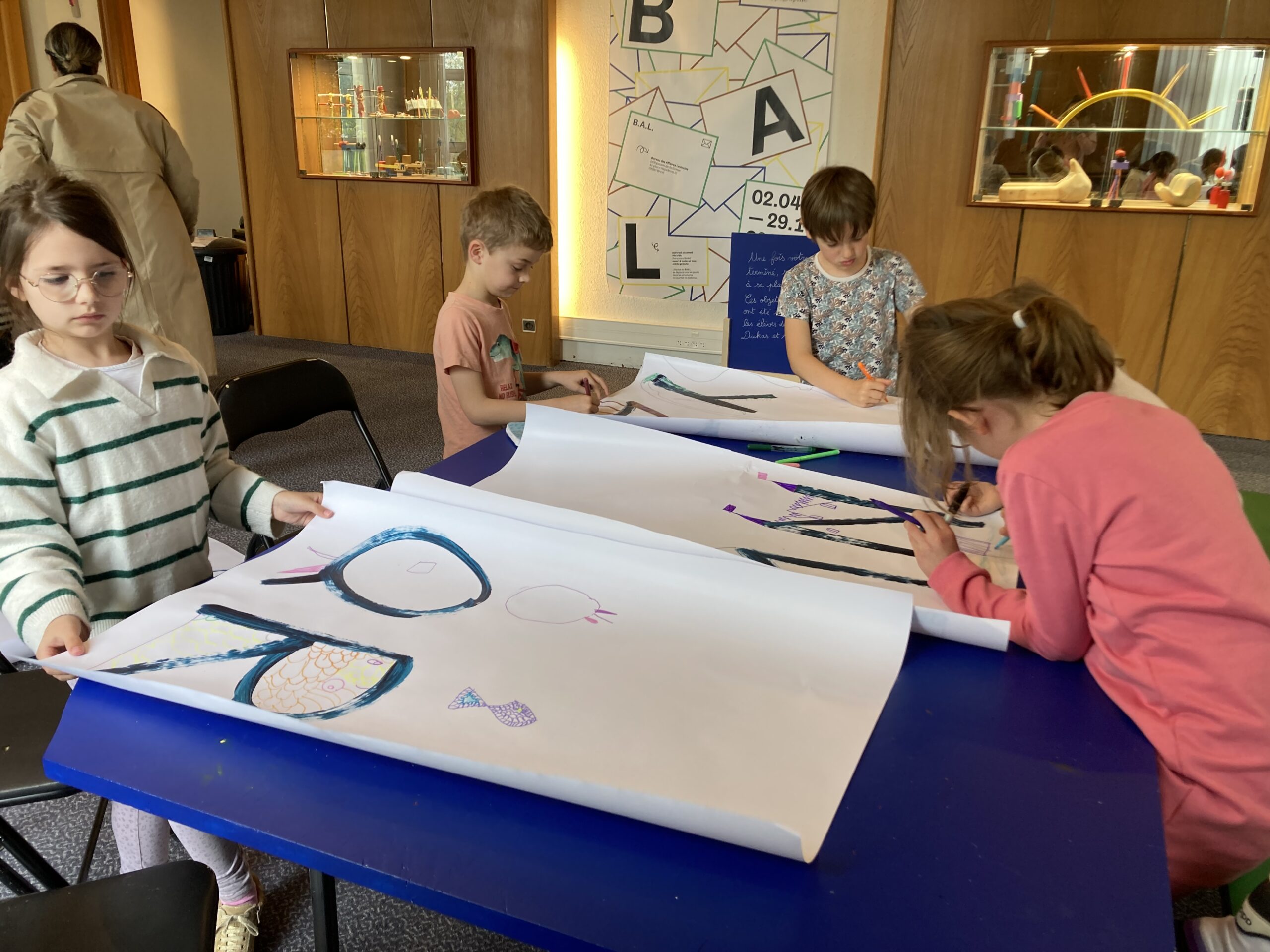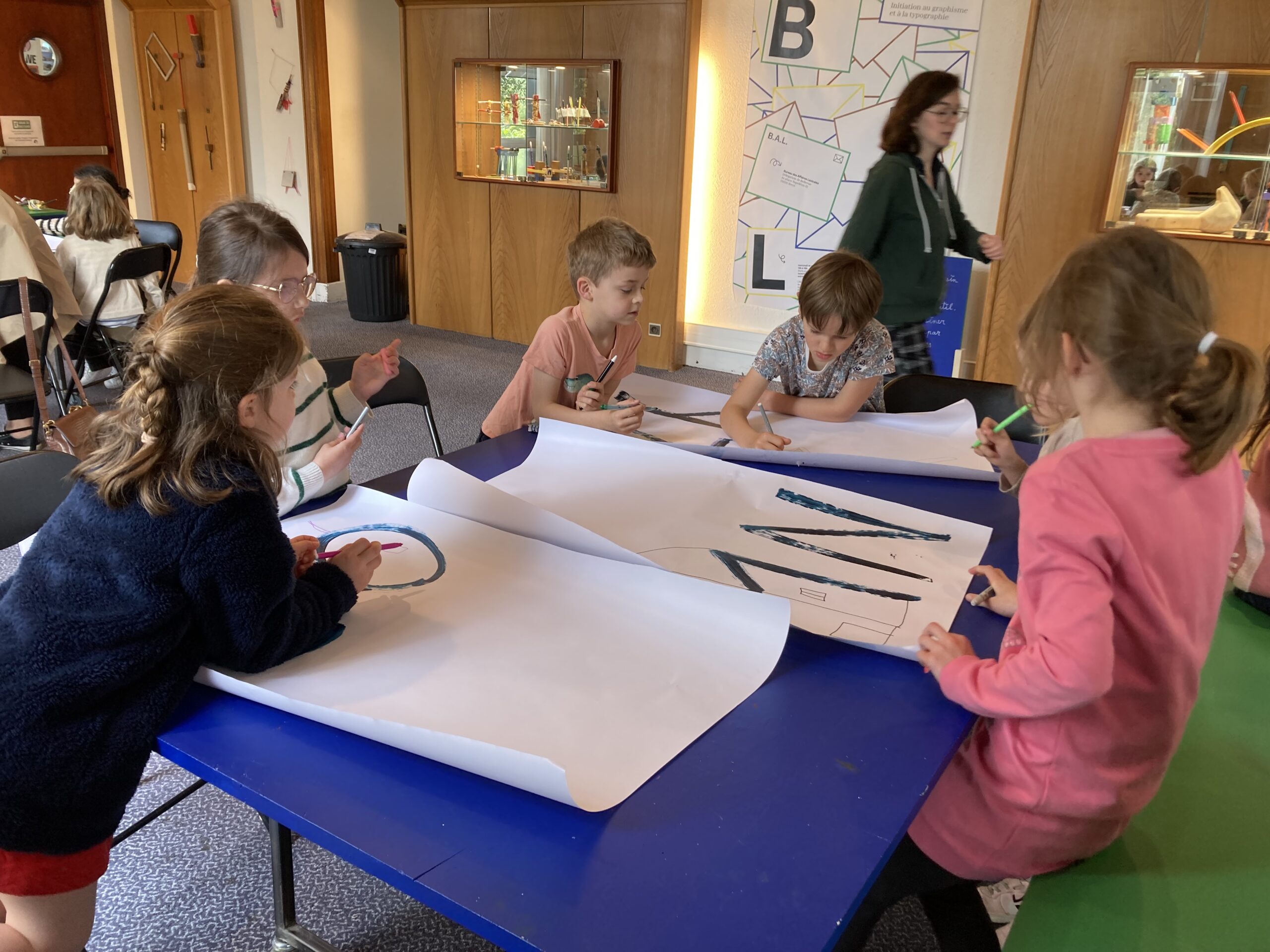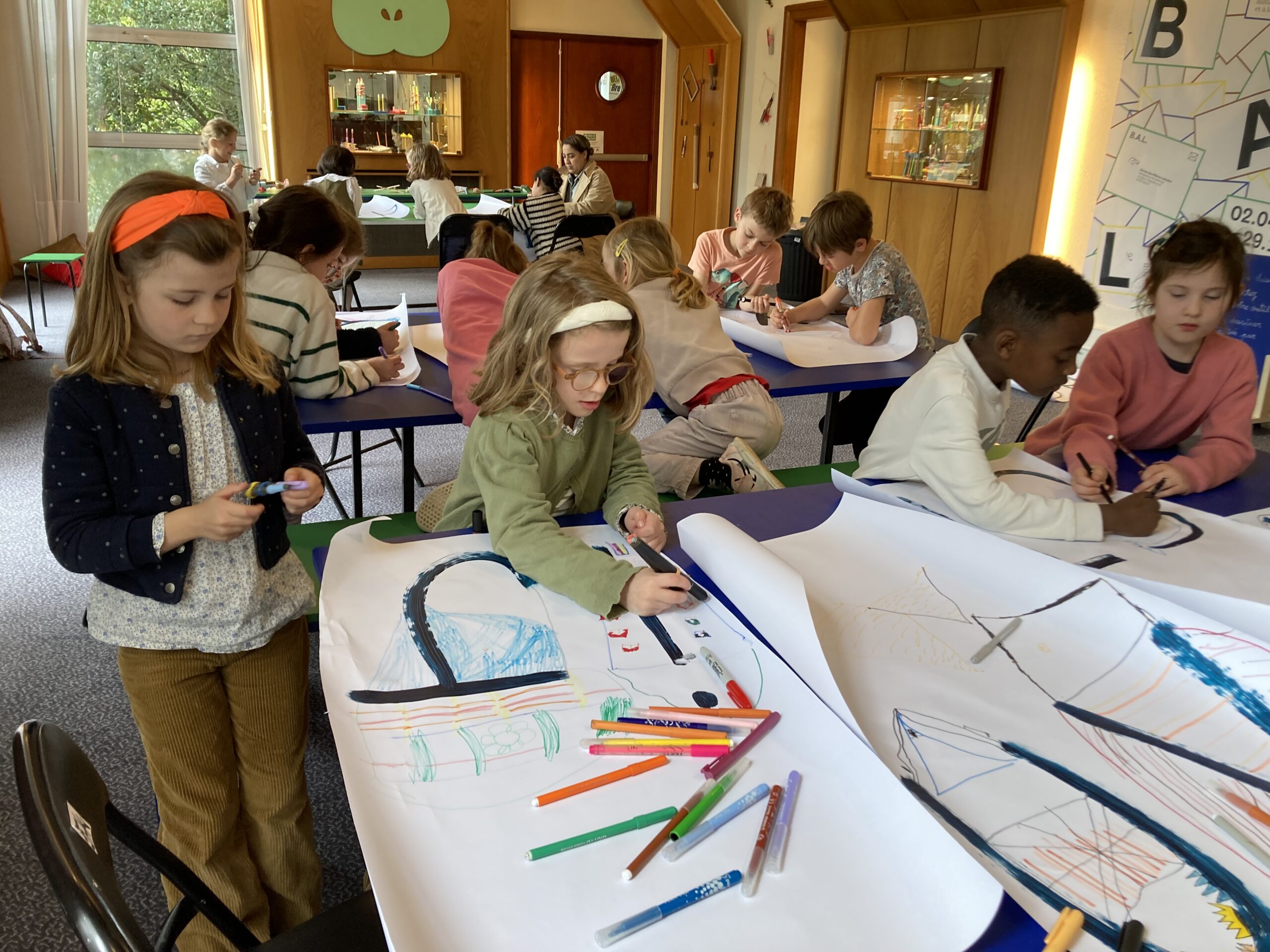 – un moment de création sur de grandes feuilles avec des lettres tracées sommairement que les élèves devaient détourner, agrémenter à l’aide de feutres.