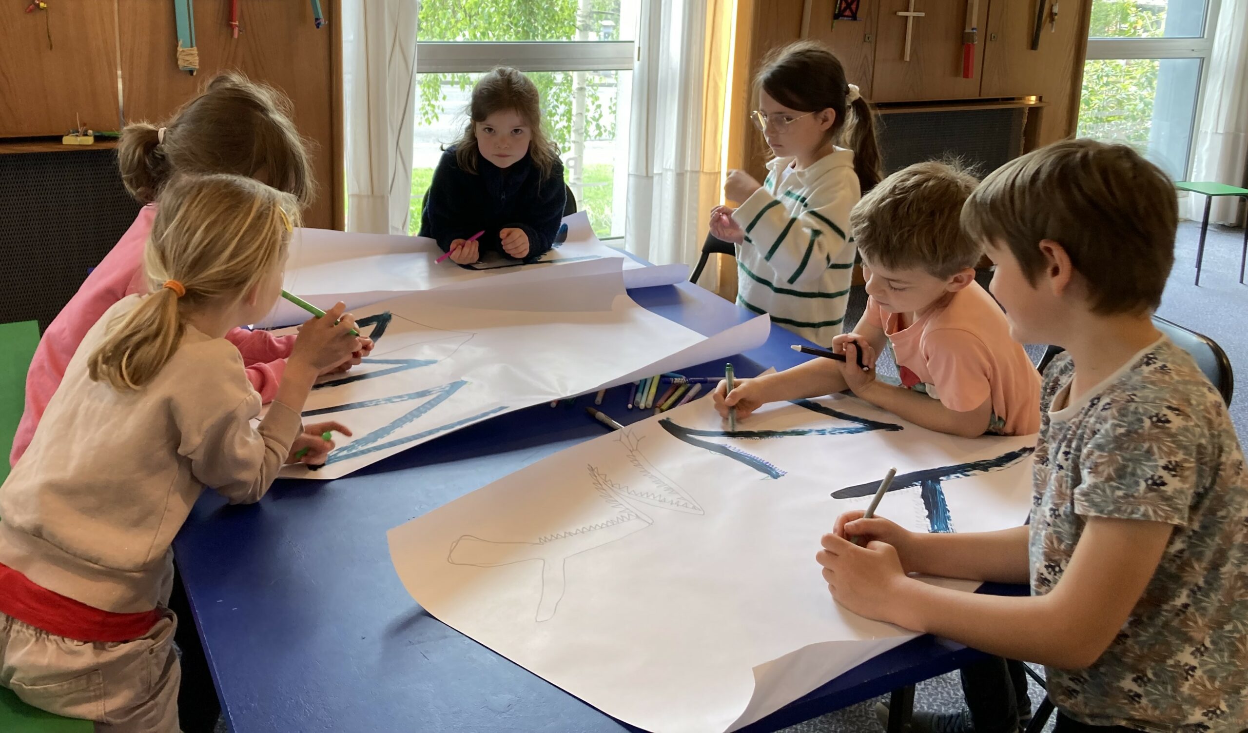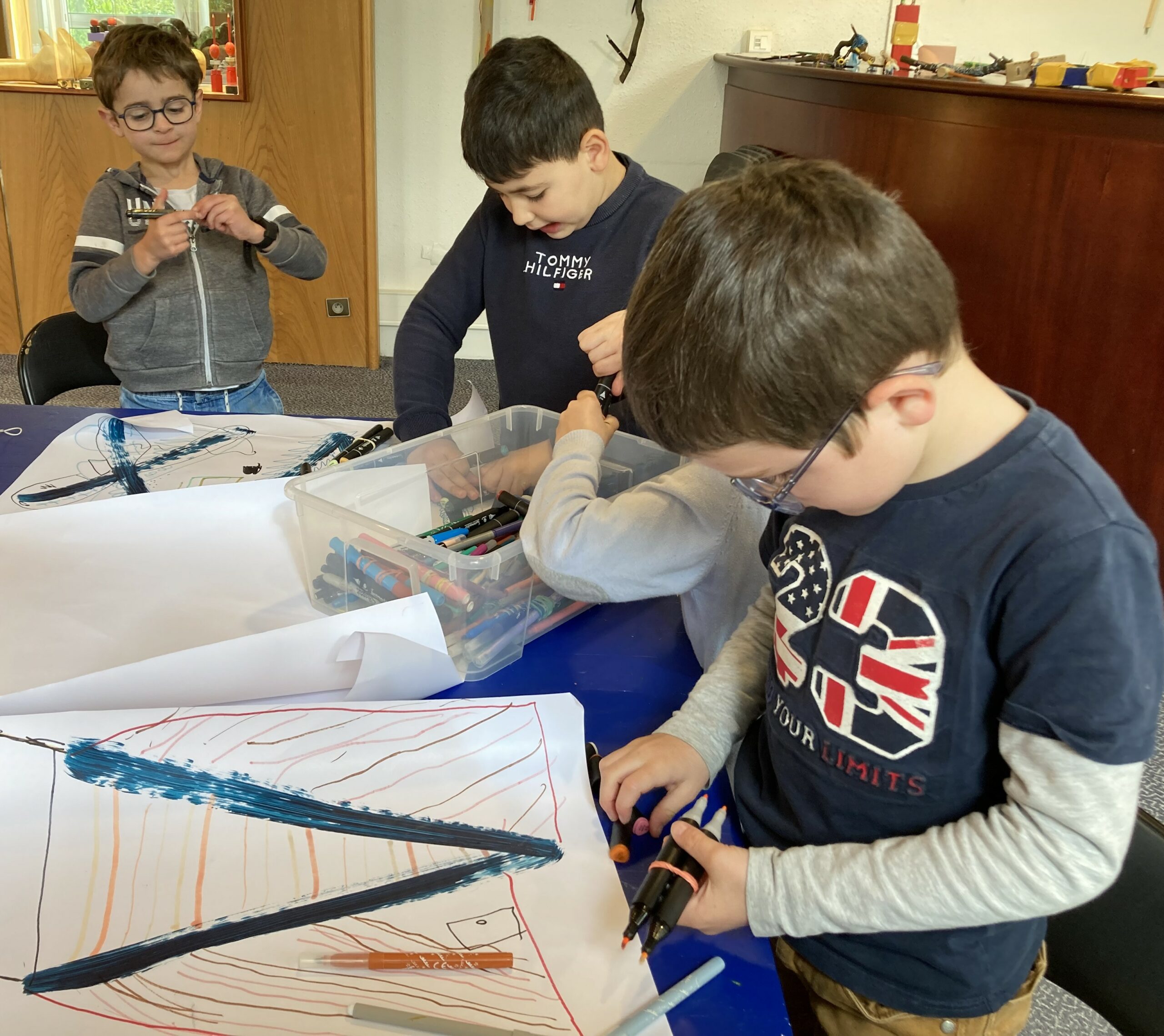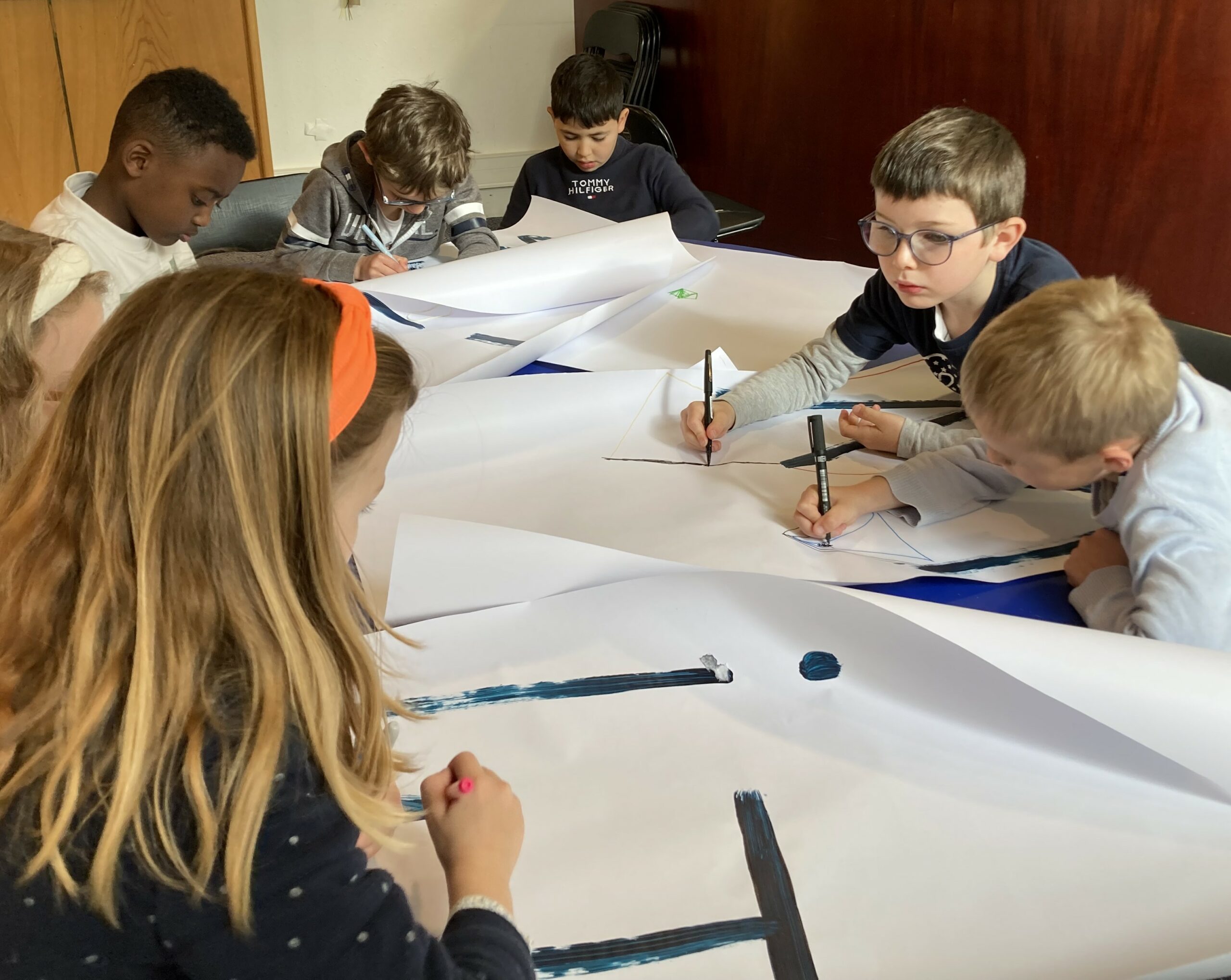 – un moment de création sur de grandes feuilles avec des lettres tracées sommairement que les élèves devaient détourner, agrémenter à l’aide de feutres.
